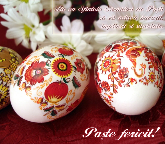 Fie ca spiritul Sfânt al Sărbătorilor de Paşte să vă lumineze sufletele şi casele! Dumnezeu să vă binecuvânteze şi să vă ocrotească! Paşte fericit!